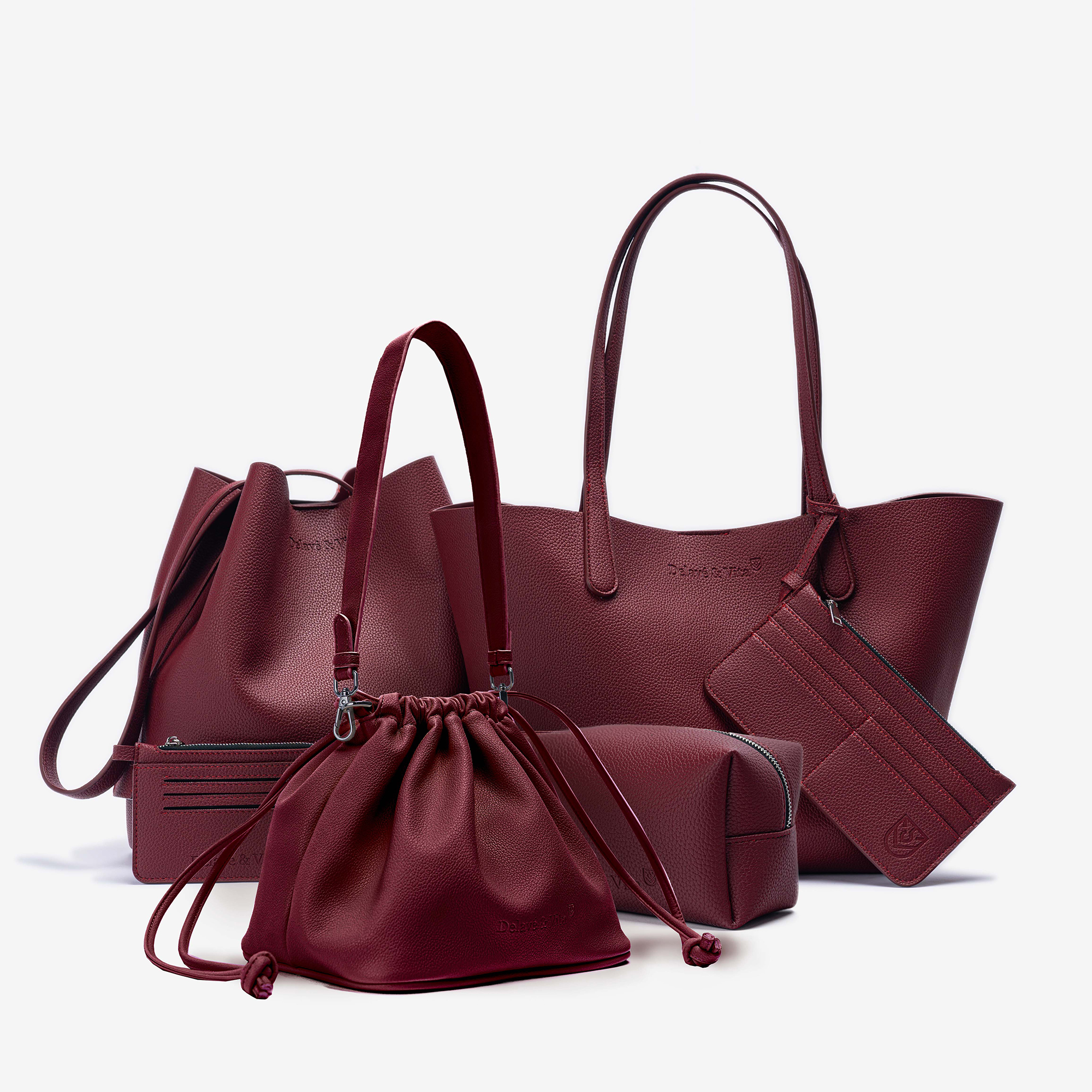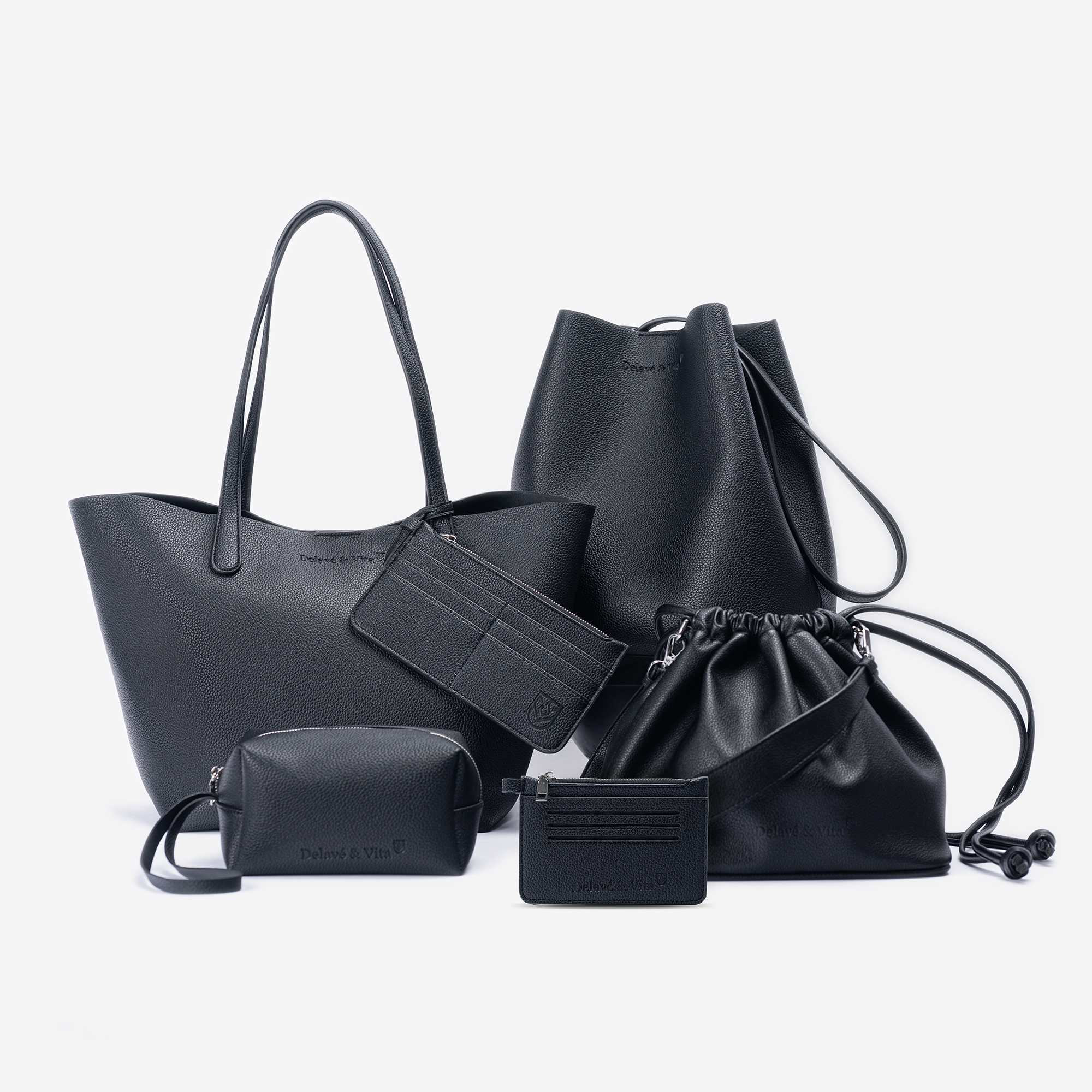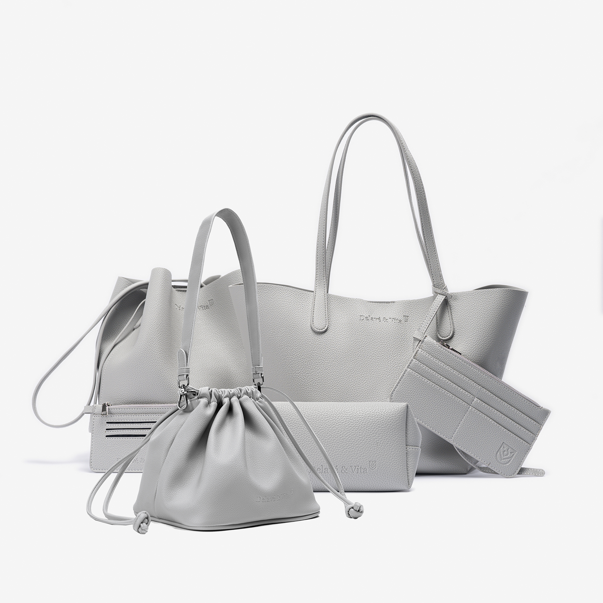 Combo full-set includes 6 products: 1 Vita Tote Bag, 1 Maie Tote Bag, 1 Katt Bucket Bag, 1 Go-on Pouch, 1 Mimi Slim Wallet, 1 Tiny Top Zip Wallet.