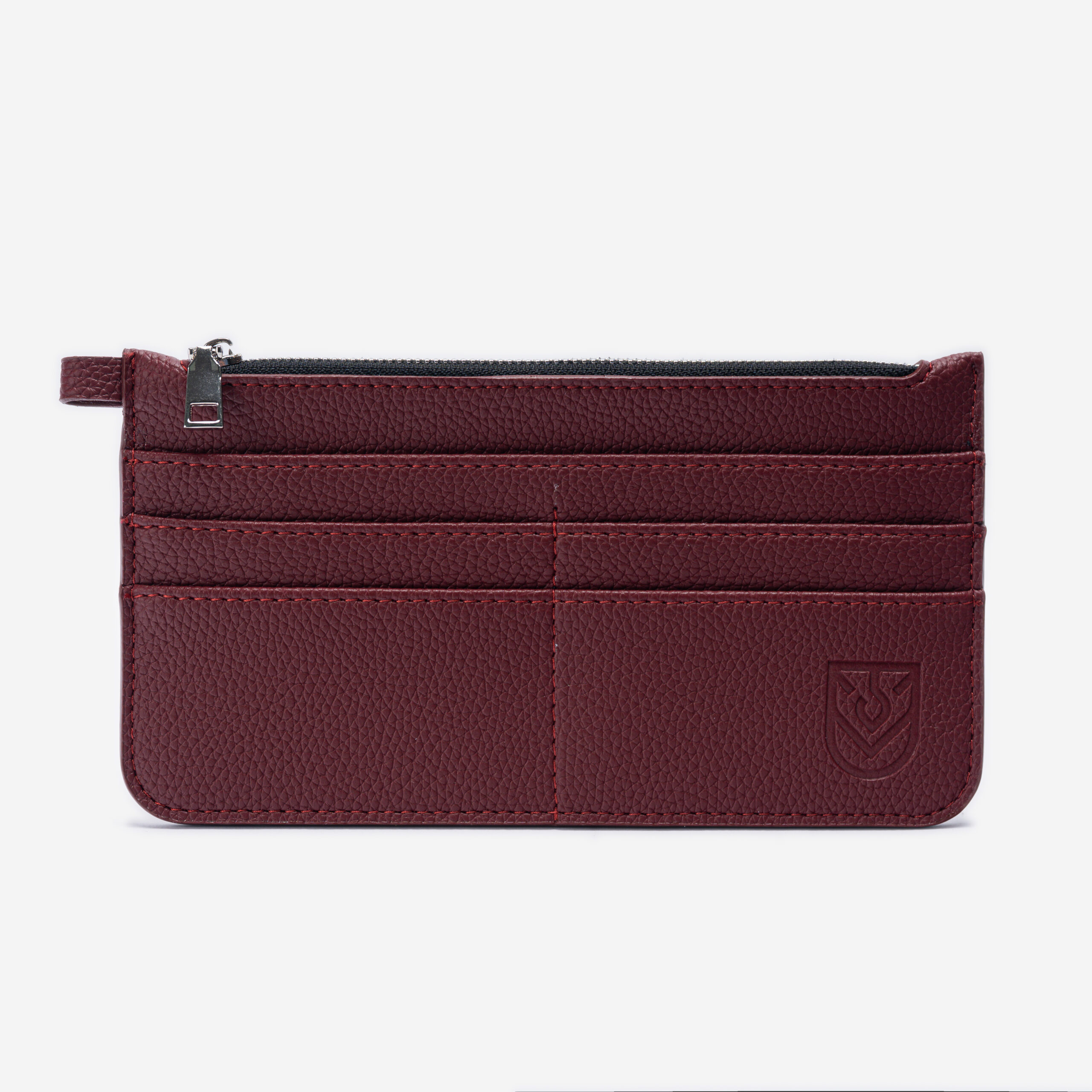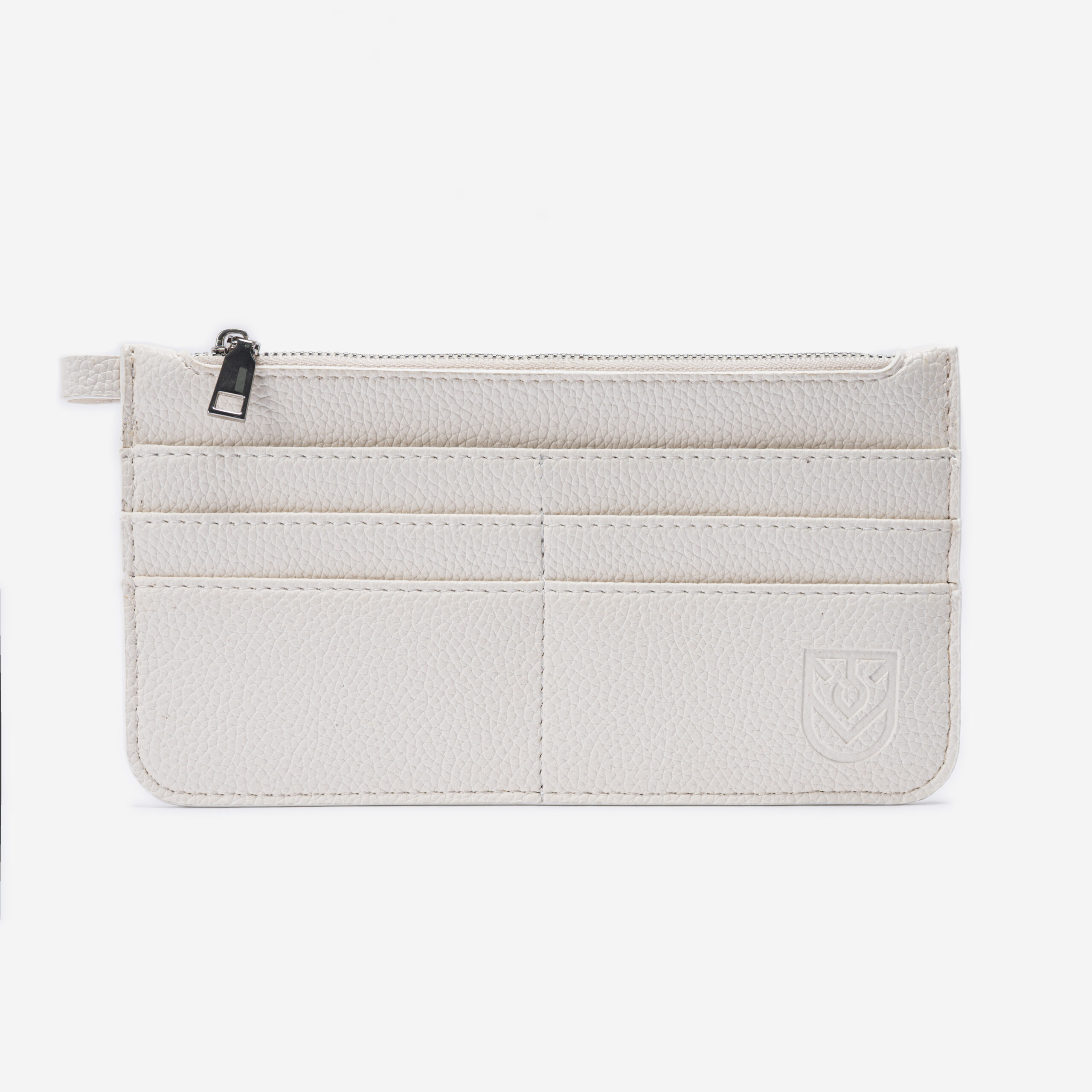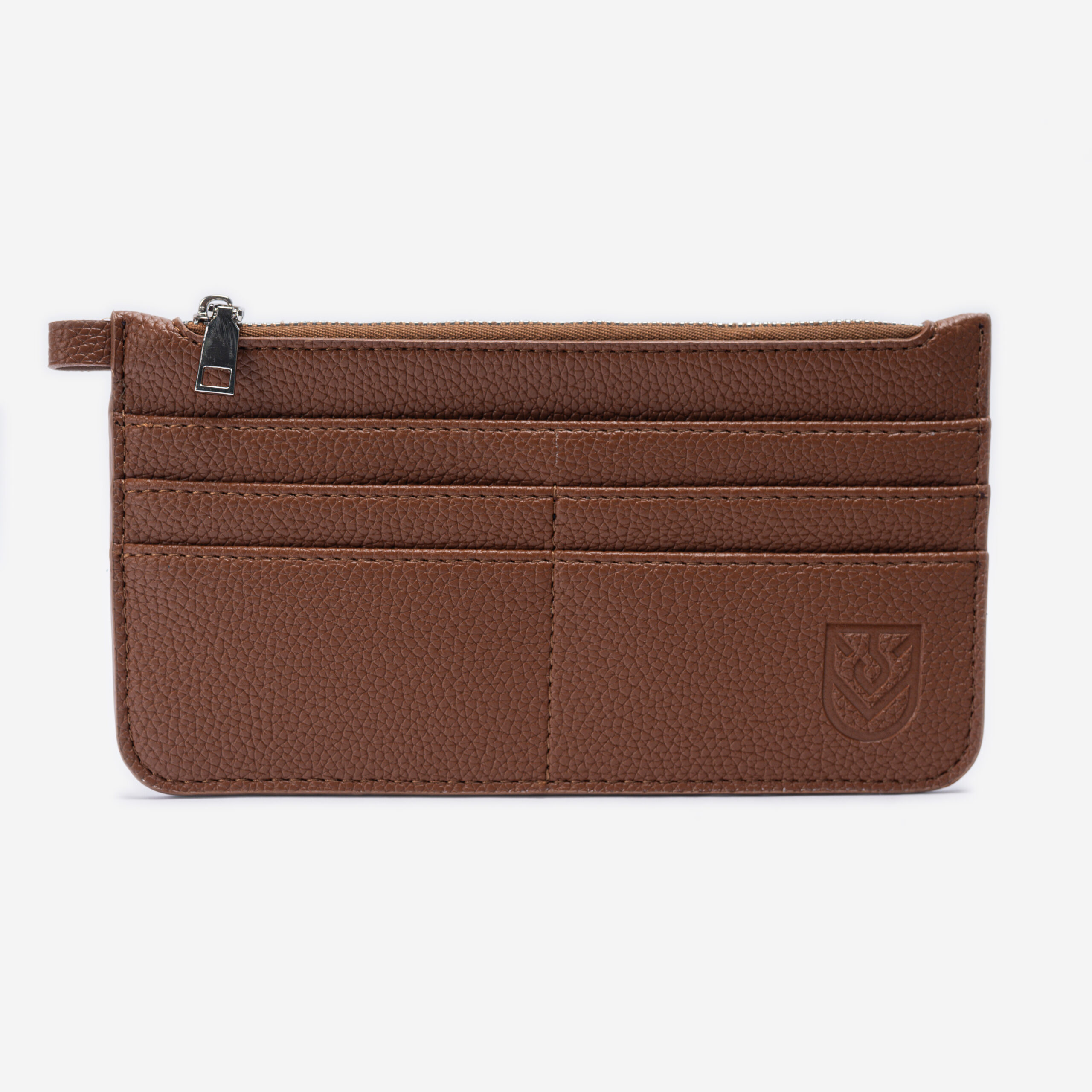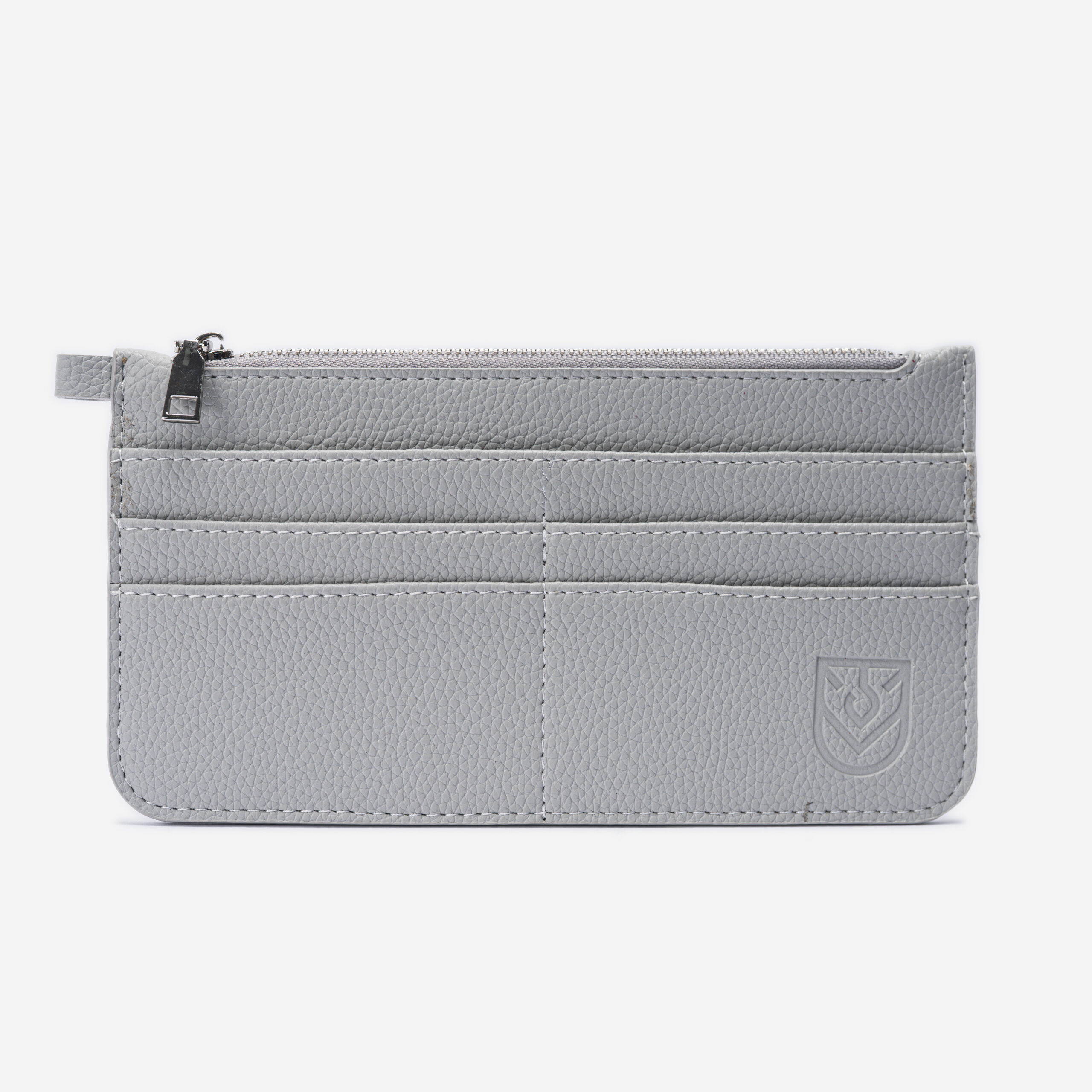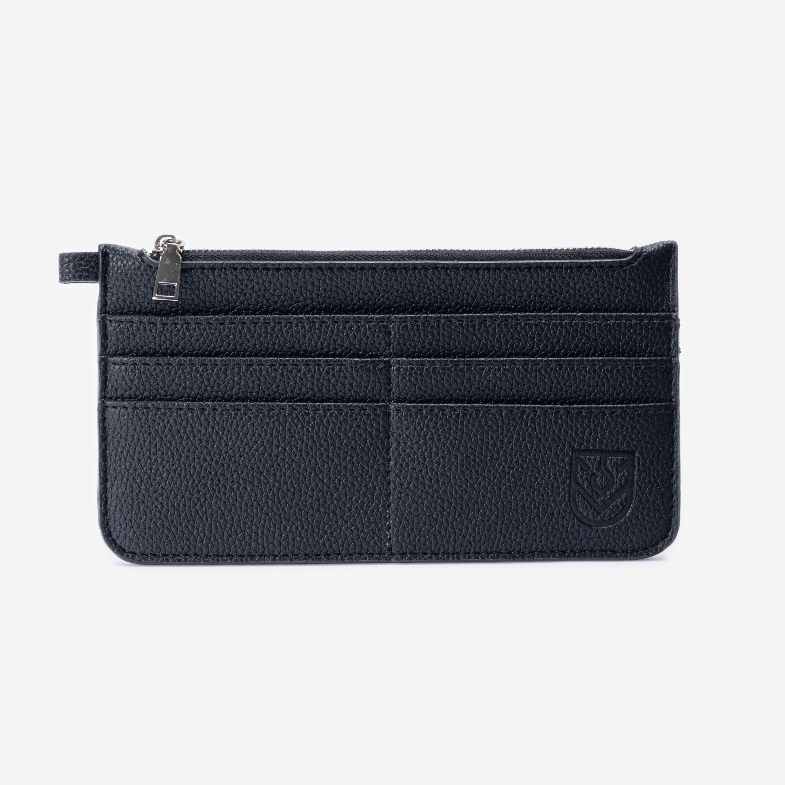 • Practical layout: top zip pocket for cash/coins/smalls + front card slots; refined debossed logo.